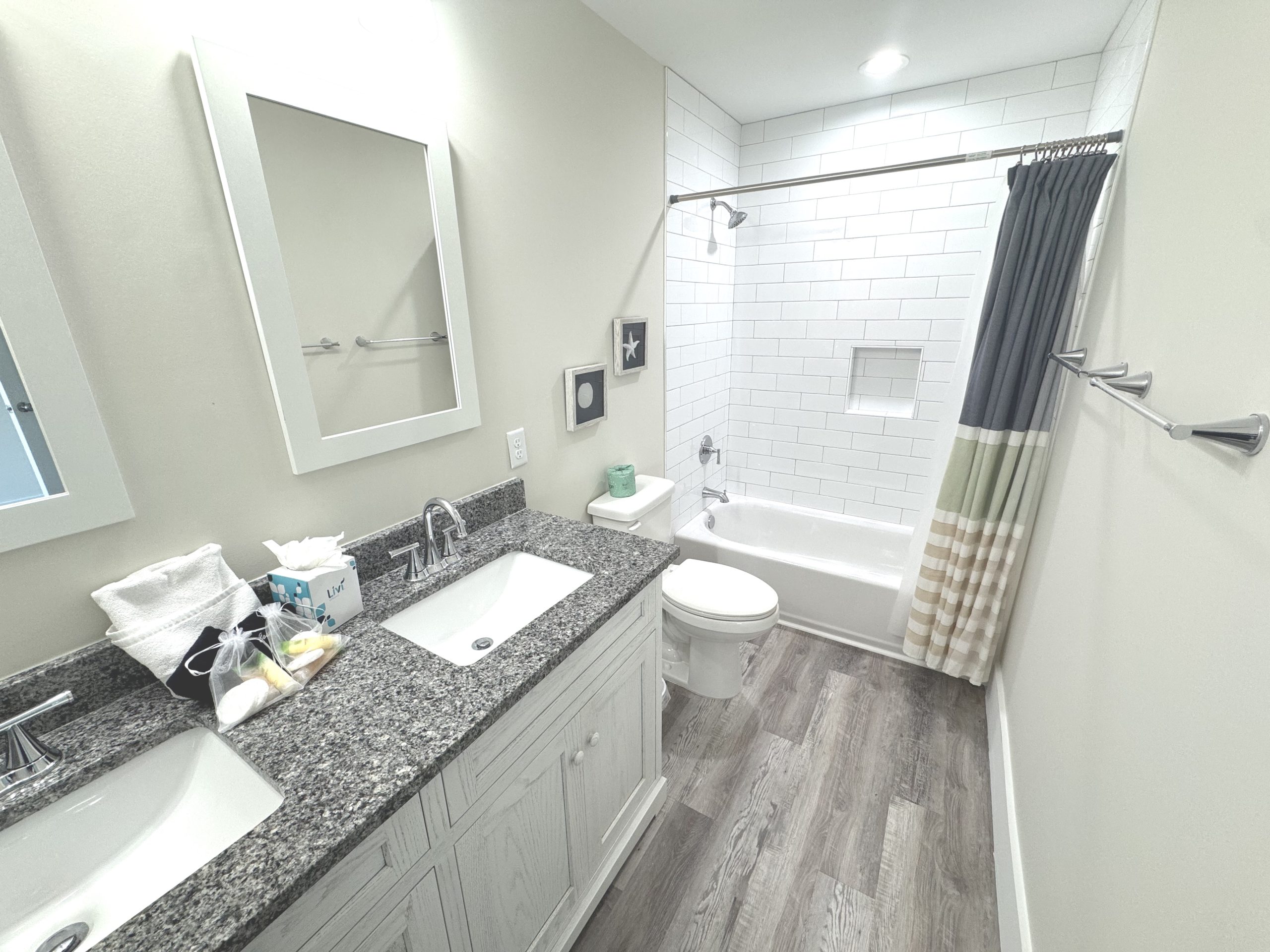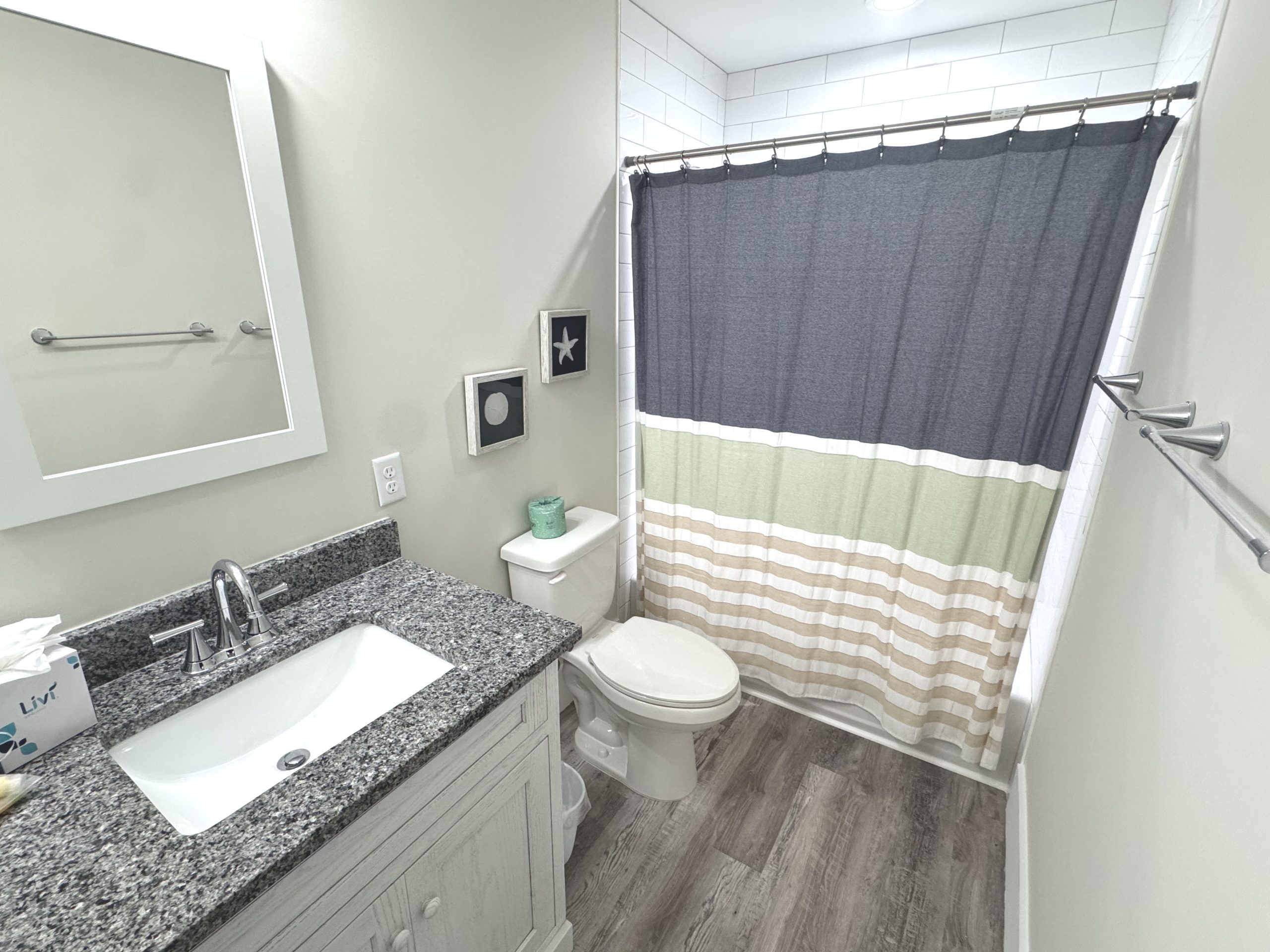 The large outdoor living space has everything you need to enjoy long days by the pool or the beach, both in and out of the sun. The pool deck faces East so it gets plenty of sunshine throughout the day and the outdoor space was designed with multiple covered areas so everyone can spend the day outdoors. Outdoor area includes private pool and hot tub (heat available for additional charge of $700 per week of $100 per day of your stay), screened in porch, covered sitting/eating area with flatscreen TV, covered eating area, gas grill, plenty of beach chairs, umbrellas, sand buckets and toys, boogie boards, noodles, and an outdoor shower. There is a conveniently located indoor half bath, refrigerator, and ice machine at the pool level as well. Load up the wagon, grab the beach chairs, fill your cooler and take just steps to one of the best beaches on the east coast all without having to go back inside the house.