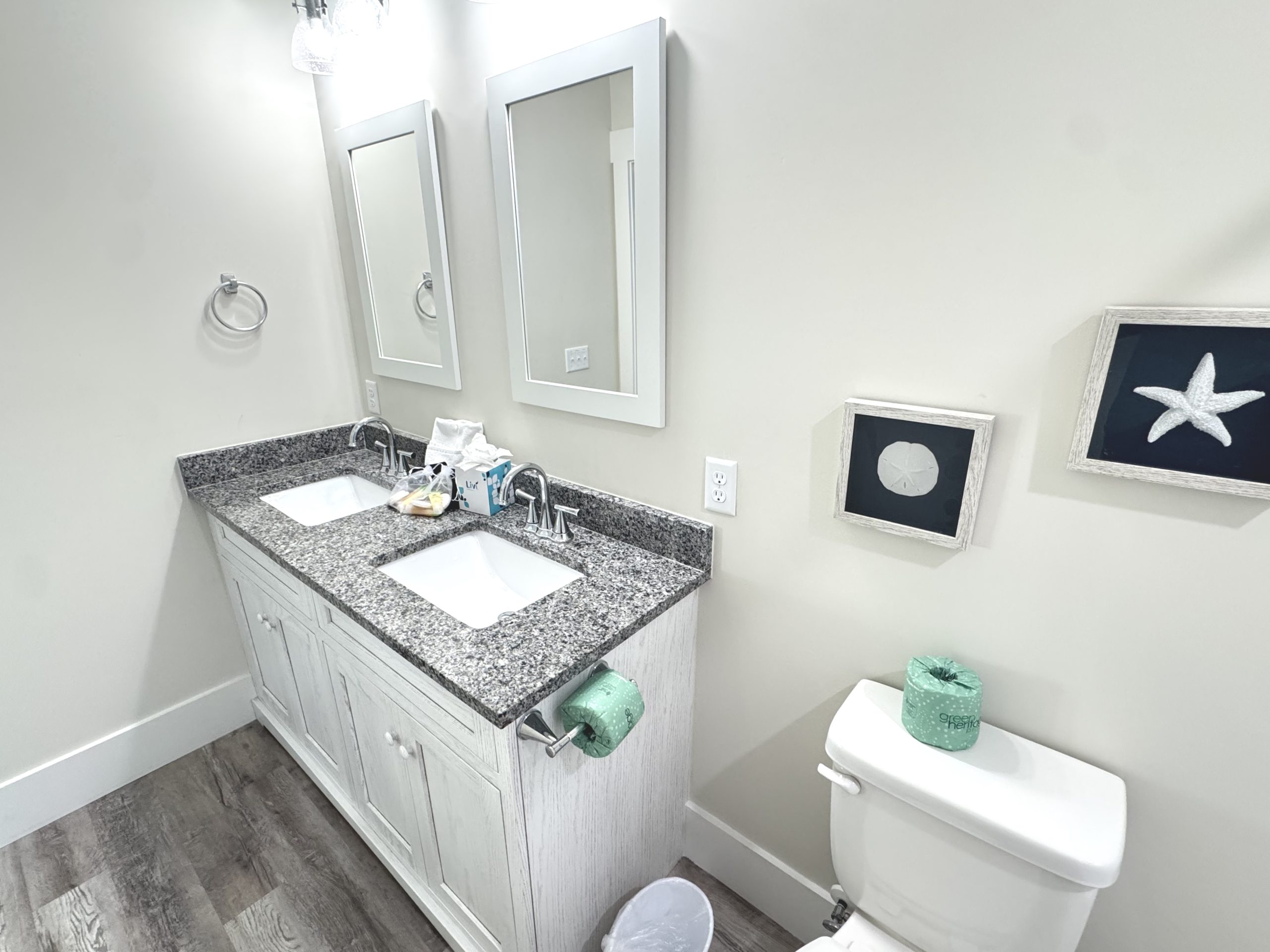 The main floor is designed for everybody to socialize together in the open floor plan. The large kitchen with granite countertops, stainless appliances and 4 seat island counter; large living room with 10 person sectional couch and huge flat screen TV; 12 person dining table; and fireplace are all connected in a large open great room setting. Everybody can eat, relax, and recline together. There is a Keurig and traditional coffee pot maker in the kitchen. Finally, there is a half bath powder room on the main floor as well.